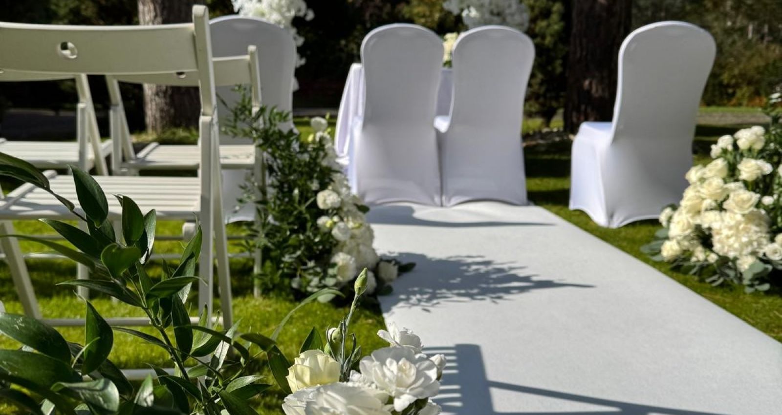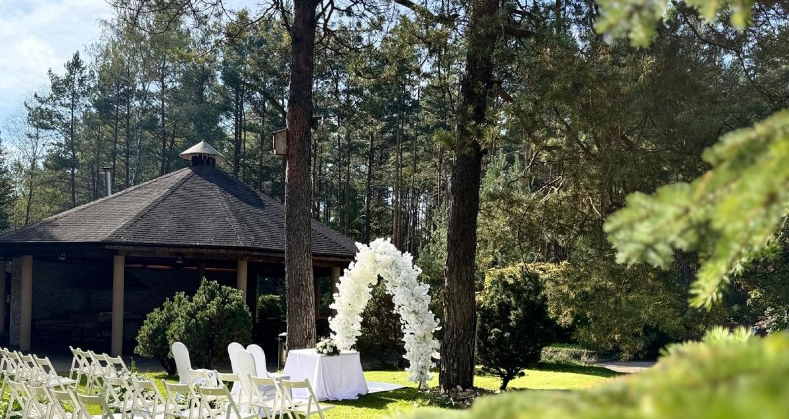 W zielonym zacisznym ogrodzie, w środku lasu, czerwony dywan prowadzi młodą parę wprost do przysięgi małżeńskiej.